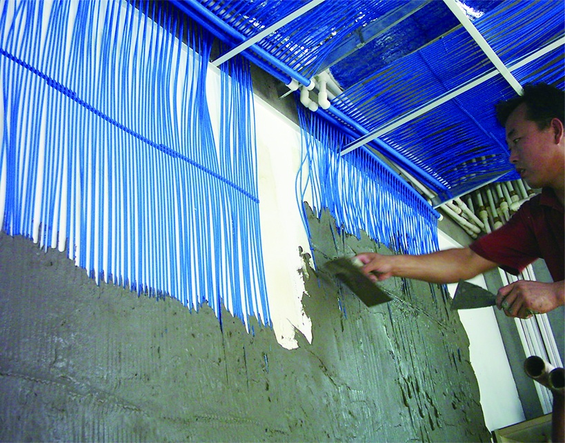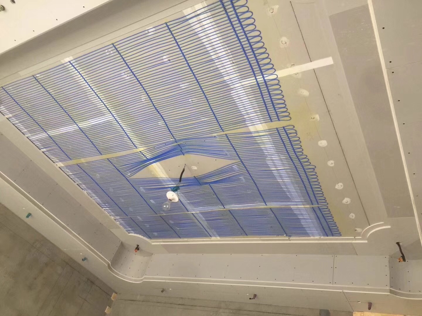 采用4.3X0.8 mm 的PPR塑料毛細管組成的間隔為10 mm – 30 mm 的網(wǎng)柵,猶如人體中的毛細管,起到著分配、輸送和搜集液體的功能。在網(wǎng)柵中和人體毛細管中的液體流動速度基本相同,都在0.05 – 0.2 m/s之間。同時人體皮下組織的毛細血管與周圍環(huán)境成功地進行了傳熱交換,達到自身溫度調(diào)節(jié)的目的。冬季毛細管內(nèi)通較低溫度的熱水,柔和的向房間輻射熱量;夏季毛細管內(nèi)通溫度較高的冷水,柔和的向房間輻射冷量。由于毛細管席換熱面積大,傳熱速度快,因此傳熱效率更高。